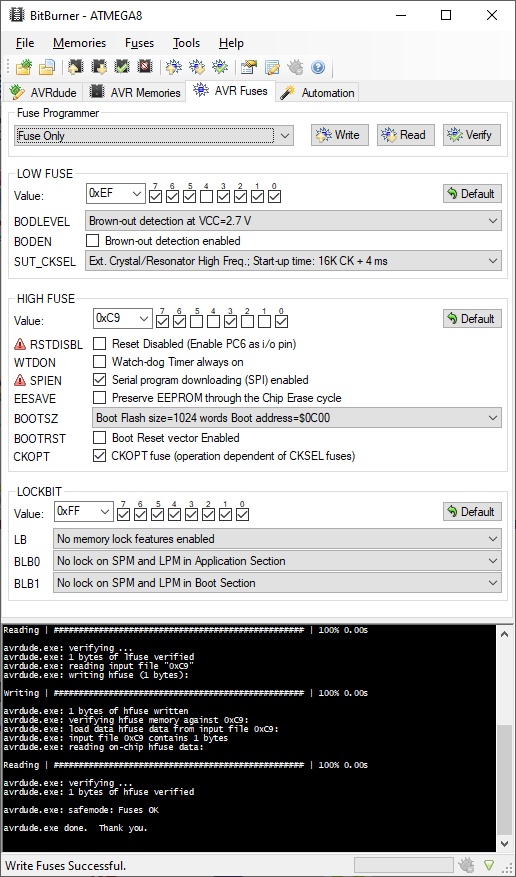 Vor vielen Jahren (unter Windows 7) nutzte ich AVR Studio 4 zum programmieren der Fuses. Leider erkennt das AVR Studio 4 unter Windows 10 kaum einen meiner Programmer. Und auch mit den neueren Versinen von AVR Studio bin ich nicht so recht klar gekommen.