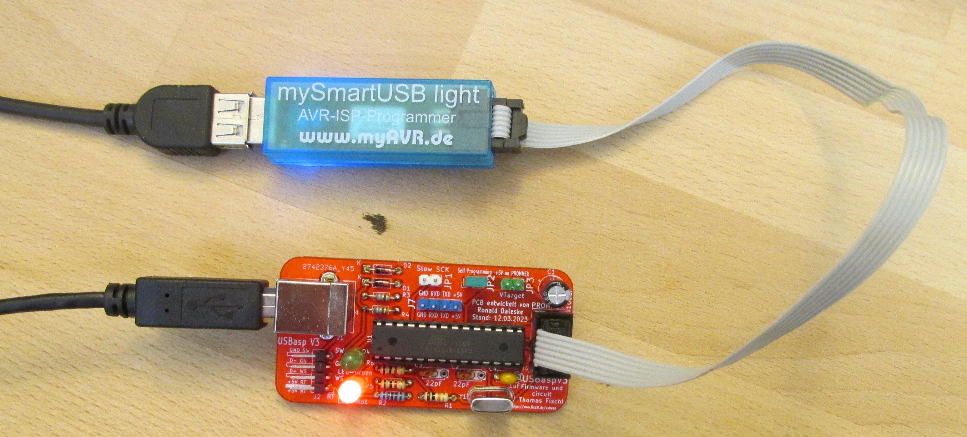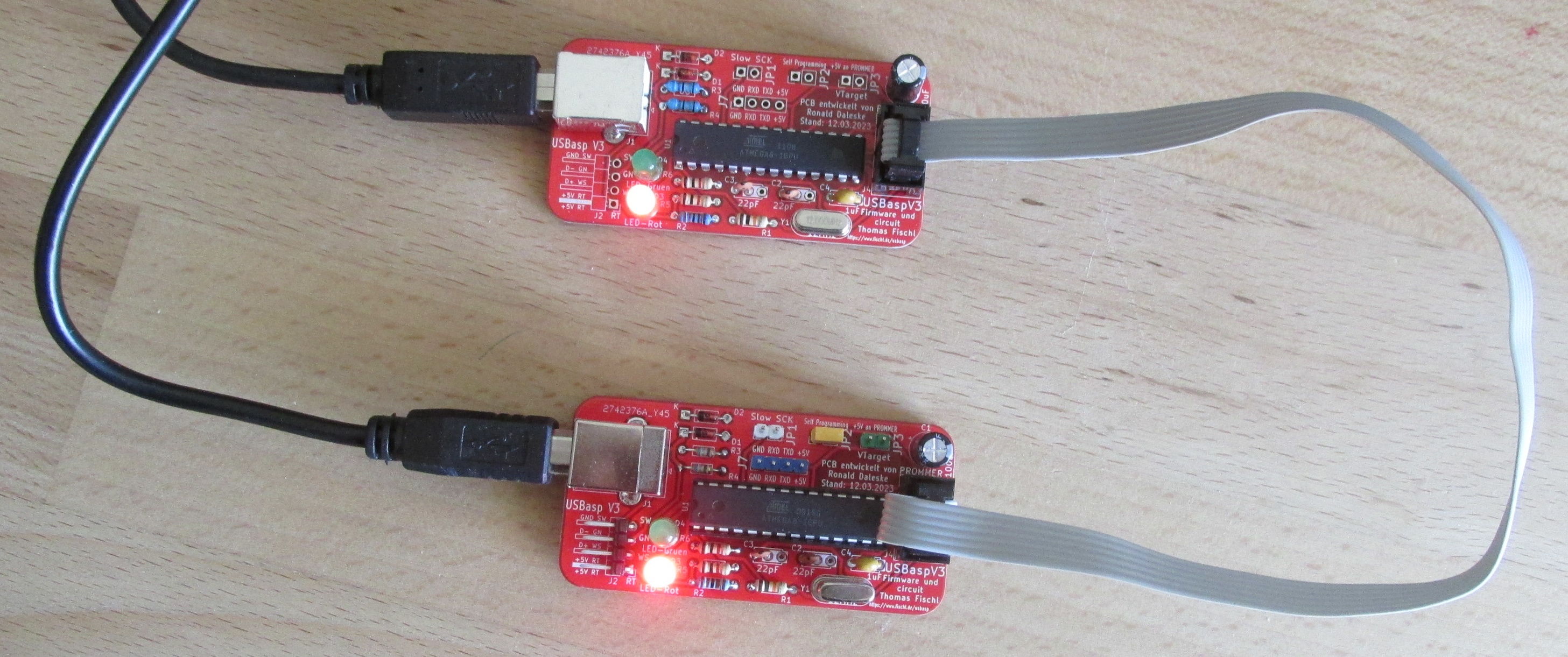Hier ein Bild, mit einem USBasp als Programmer (oben) und einem USBasp als zu programmierndes Board (unten).