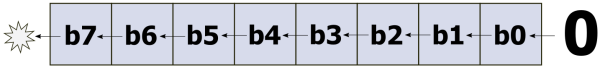 Die Prozedur SHL schiebt eine logische 0 in das Bit b0 der Variablen und verschiebt alle Bitstellen der Variable um ein Bit nach links. Der Inhalt des höchstwertigen Bits geht verloren.
