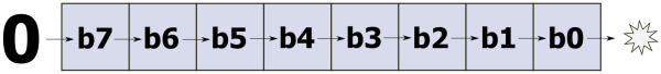 Die Prozedur SHR schiebt eine logische 0 in das höchstwertige Bit (hier Bit b7) der Variablen und verschiebt alle Bitstellen der Variable um ein Bit nach rechts. Der Inhalt des niederwertigsten Bits geht verloren.
